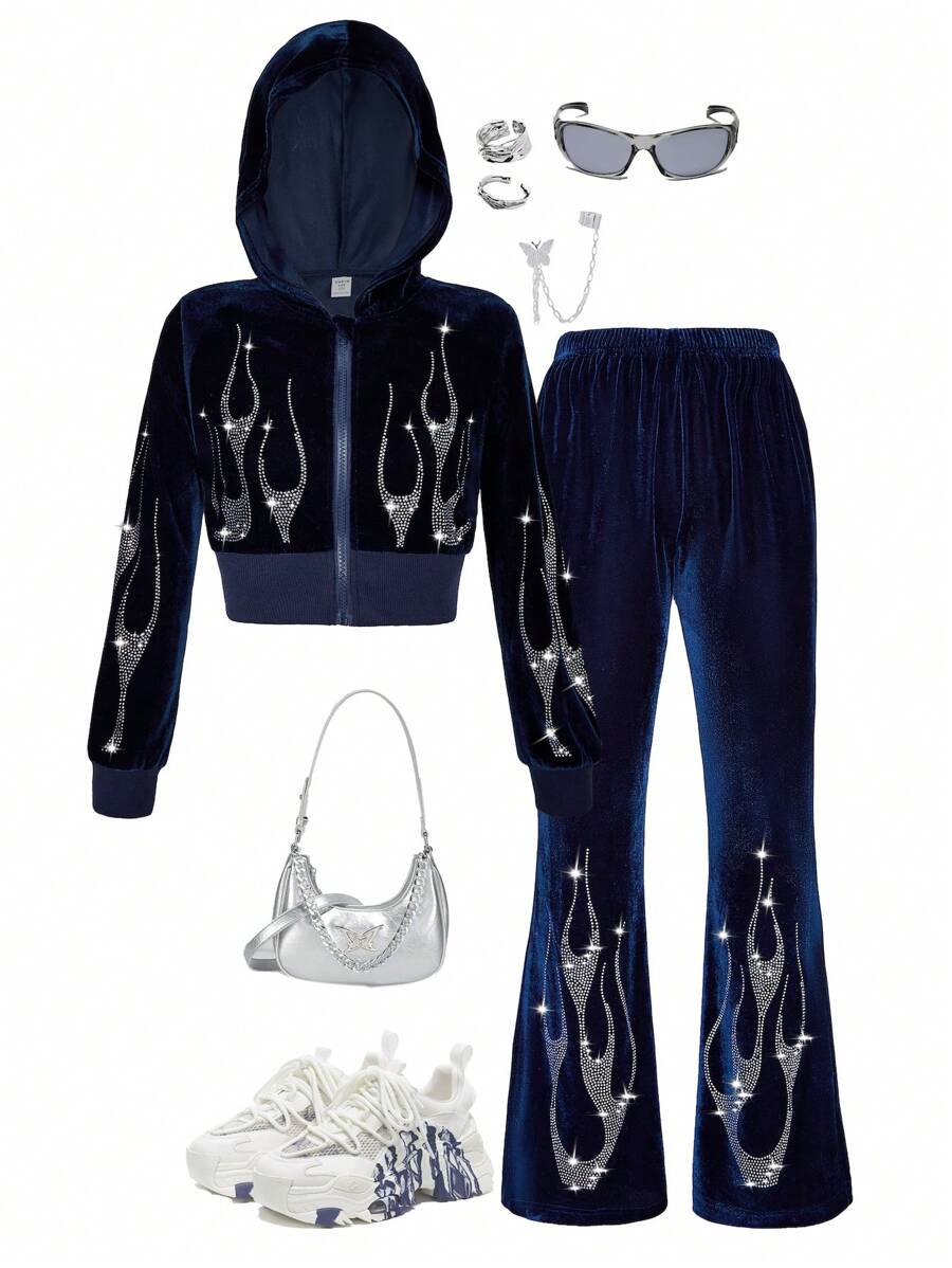 SHEIN Kids HYPEME Tween Girl Trendy Velvet Hooded Sweatshirt Suit