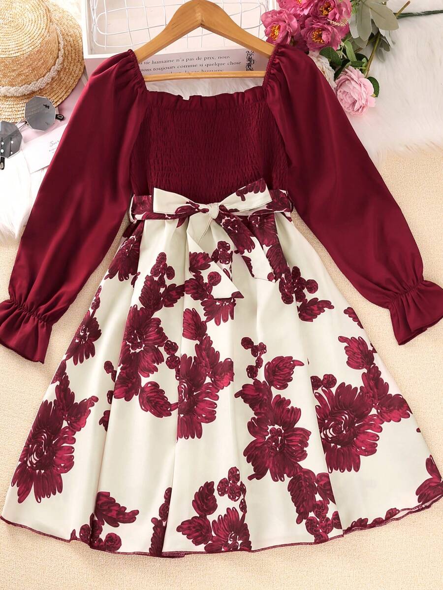 Girls (Large) Sweet Retro Floral Print Lotus Leaf Long-Sleeved Square Neck Spring And Autumn Dress