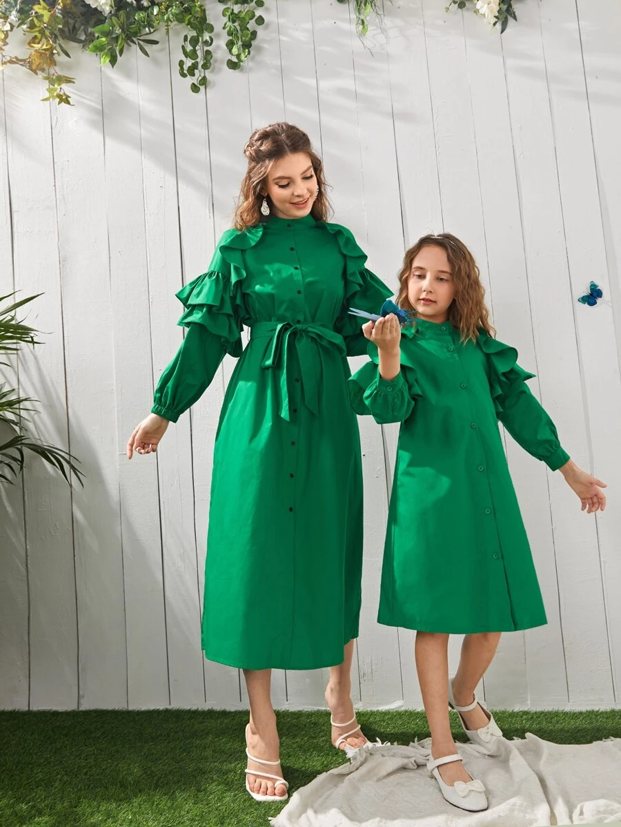SHEIN Girls 1 PC Ruffle Trim Self Belted Dress