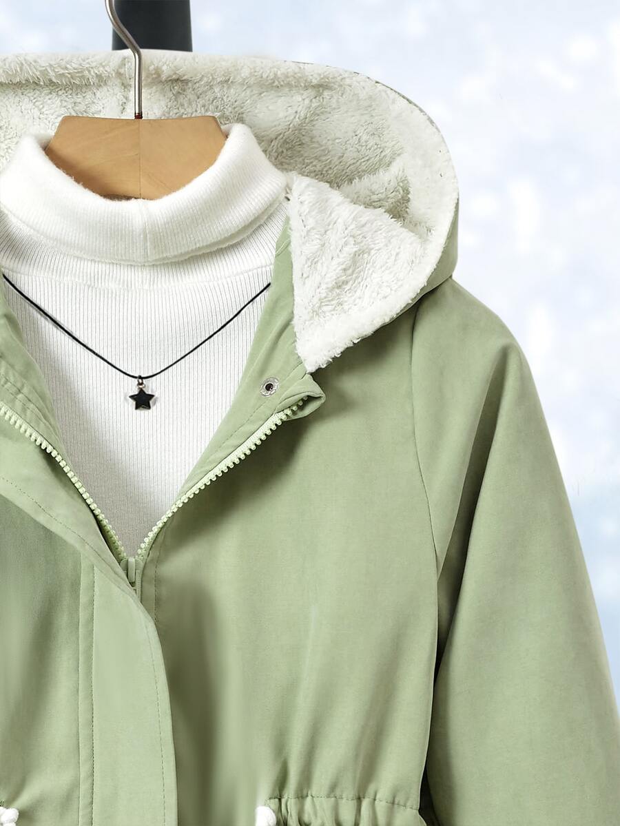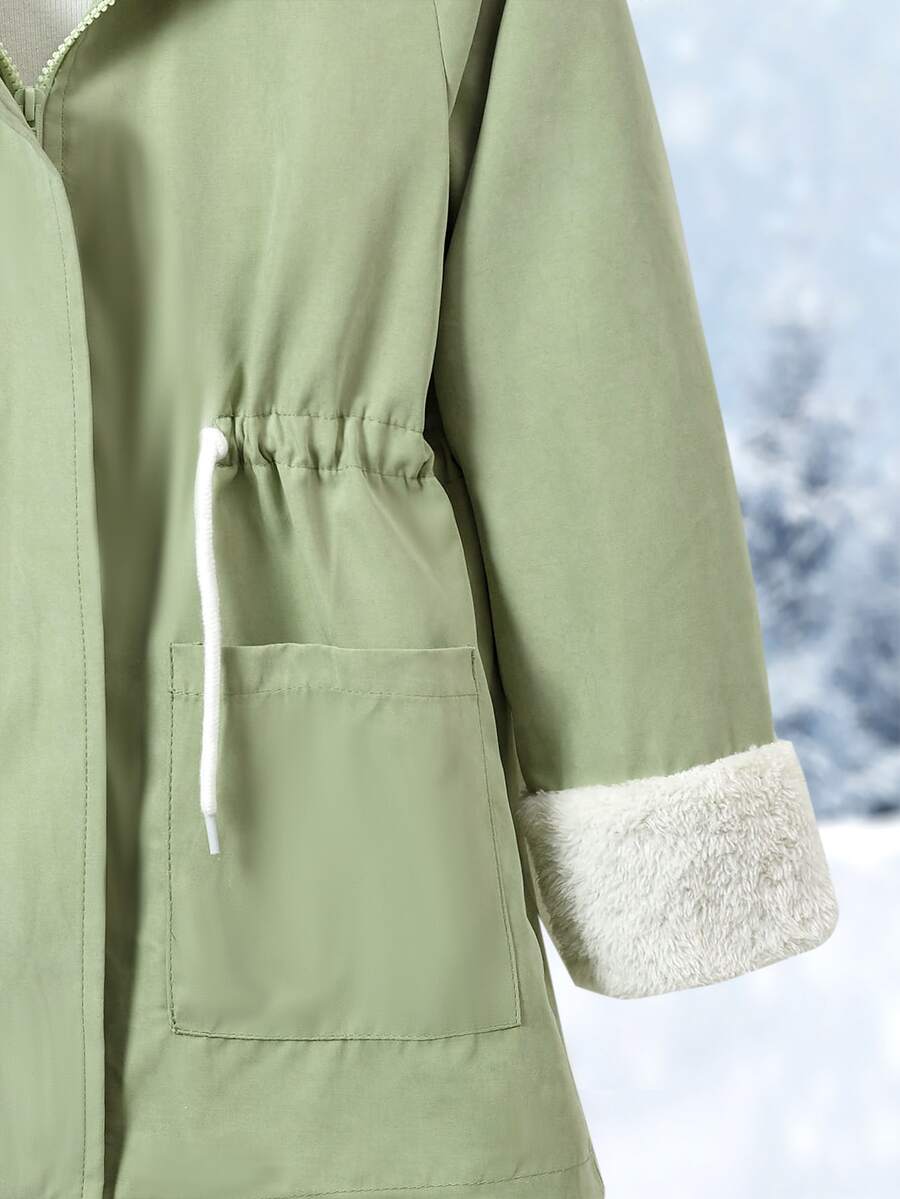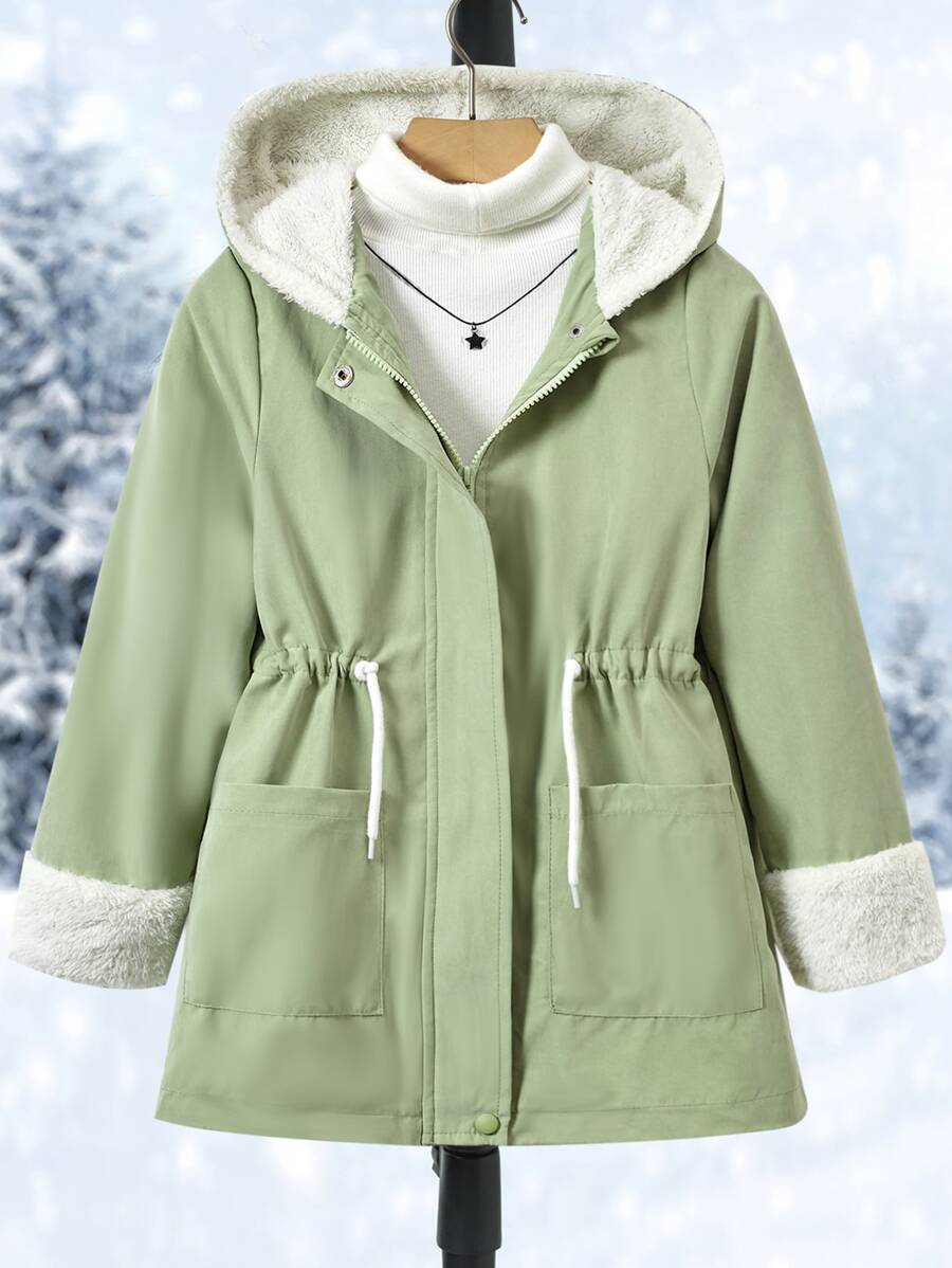 Girls 1pc Dual Pocket Drawstring Waist Teddy Lined Hooded Parka Coat