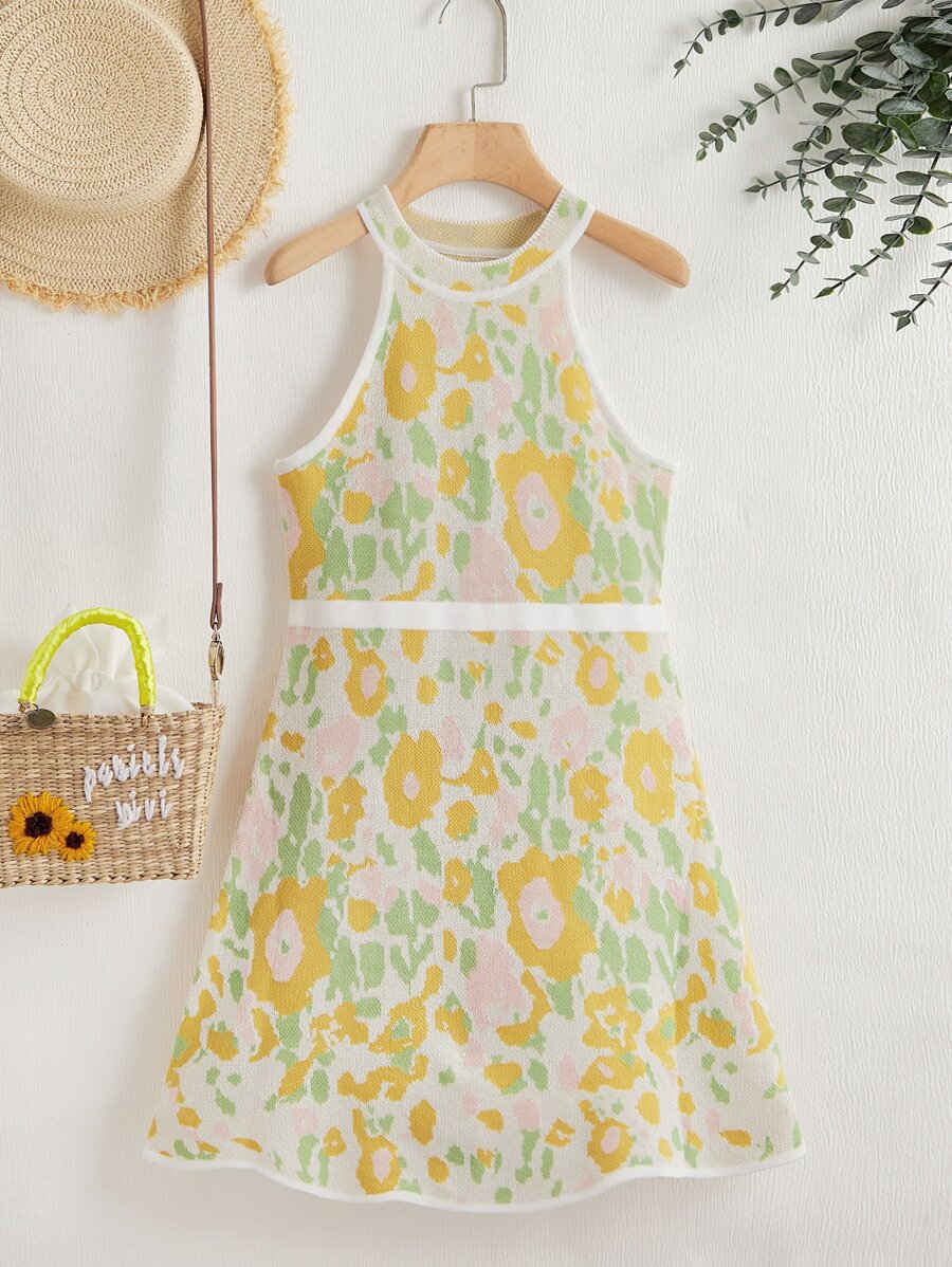 Girls Allover Floral Pattern Halter Sweater Dress