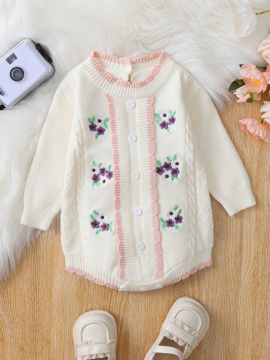 Girls Baby Floral Embroidery Contrast Binding Cable Knit Bodysuit
