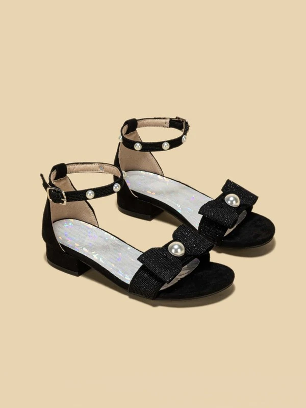 Girls Bow & Faux Pearl Decor Chunky Heeled Ankle Strap Sandals