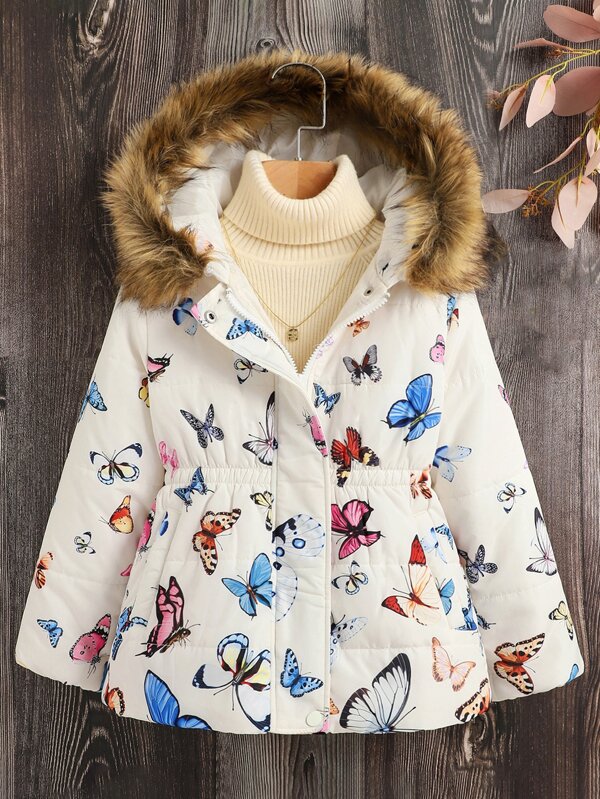 SHEIN Kids EVRYDAY Girls Butterfly Print Fuzzy Trim Hooded Winter Coat Without Sweater