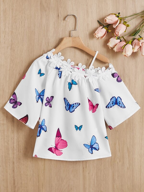 SHEIN Kids QTFun Girls Butterfly Print Guipure Lace Trim Asymmetrical Neck Blouse