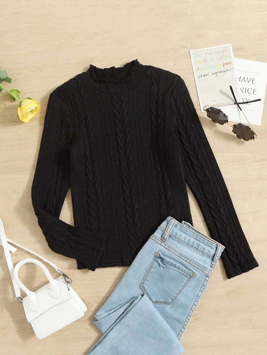 SHEIN Tween Girl Cable Textured Lettuce Trim Mock Neck Tee