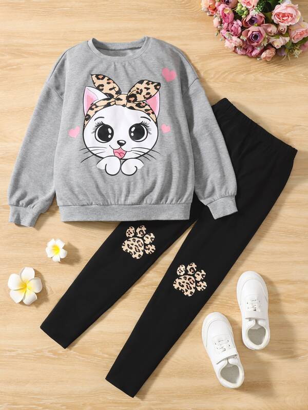 SHEIN Kids QTFun Girls Cartoon Graphic Drop Shoulder Sweatshirt & Leopard Print Leggings
