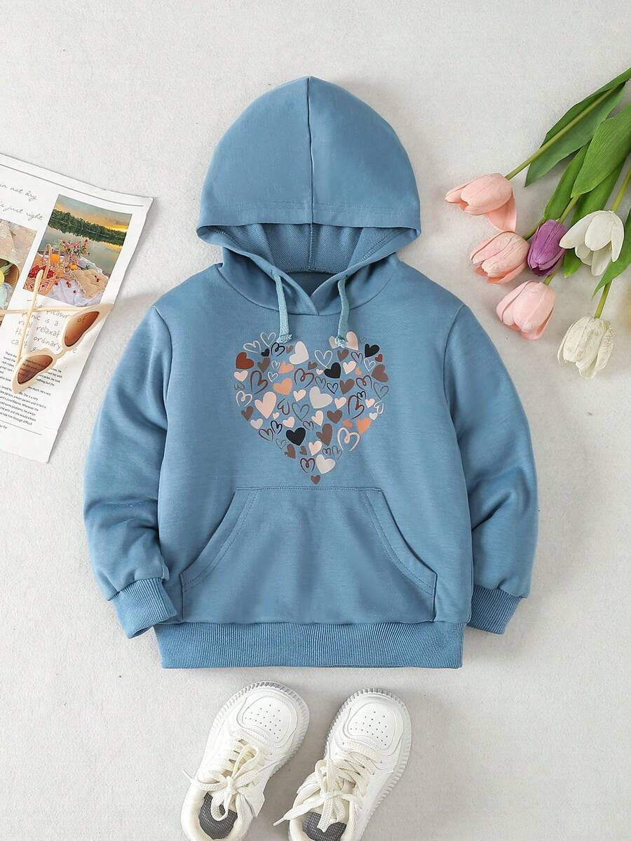 SHEIN Kids HYPEME Young Girl Casual Heart Print Hooded Long Sleeve Sweatshirt Autumn