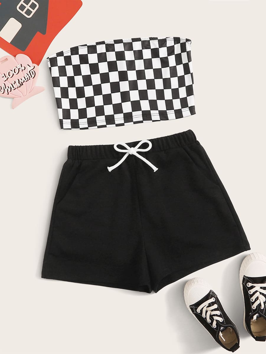 SHEIN Kids EVRYDAY Girls Checker Crop Tube Top & Drawstring Waist Shorts Set