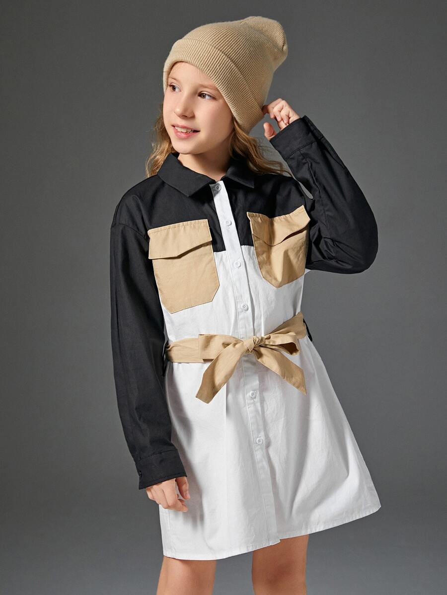 SHEIN Girls Colorblock Flap Pocket Drop Shoulder Belted Shirt Dress