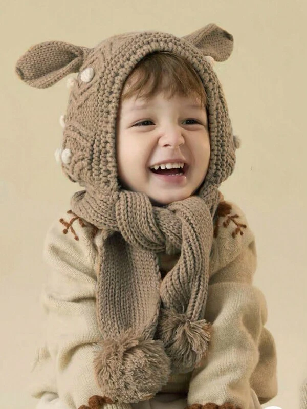 Girls Ear & Pom Pom Decor Hat With Scarf