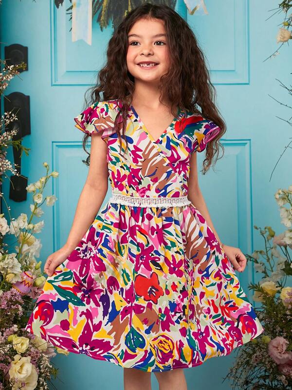 SHEIN Kids CHARMNG Girls Floral Print Contrast Lace Dress