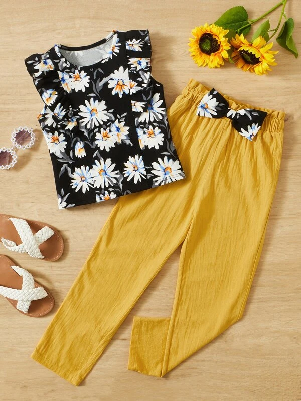 SHEIN Kids SUNSHNE Girls Floral Print Ruffle Trim Top & Bow Front Pants