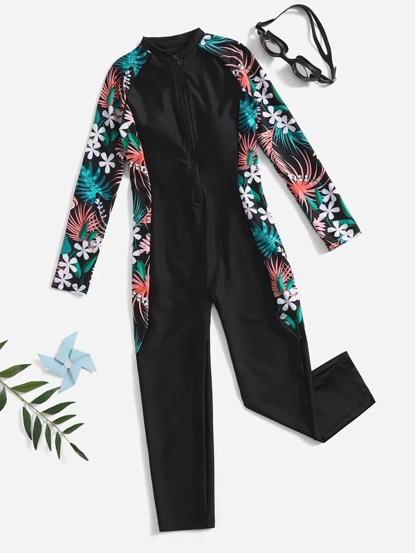 Tween Girl Floral Print Zip Front One Piece Swimsuit
