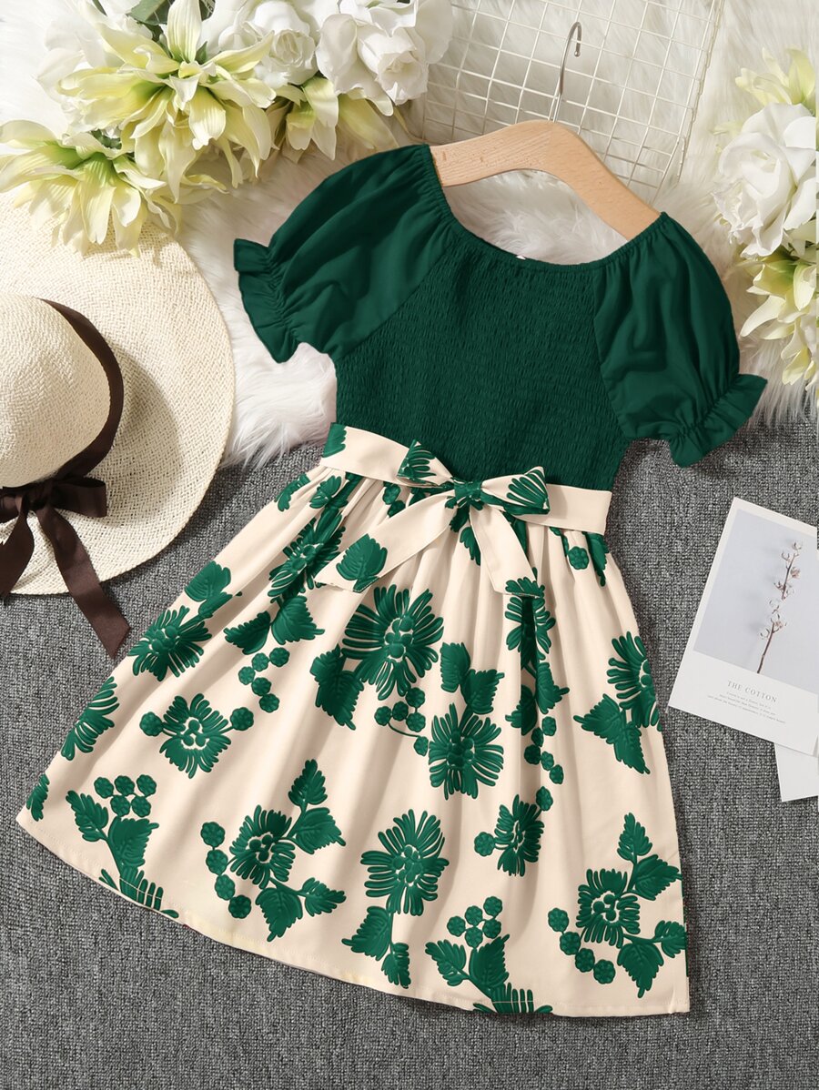 SHEIN Girls Floral Puff Sleeve Shirred Belted Flare Dress
