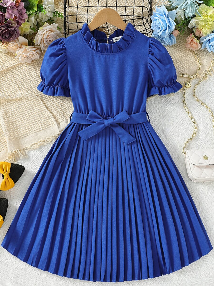 SHEIN Kids FANZEY Girls Frill Neck Pleated Hem Puff Sleeve Belted Dress