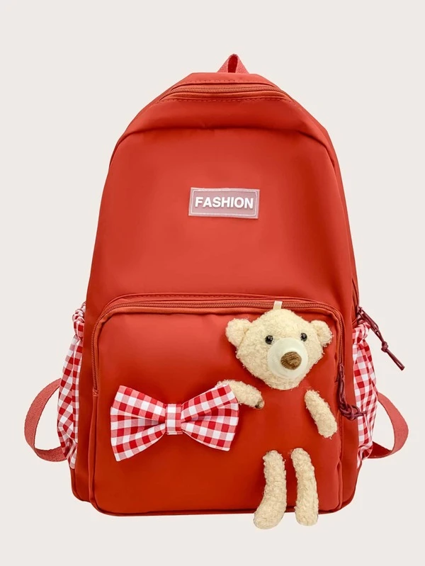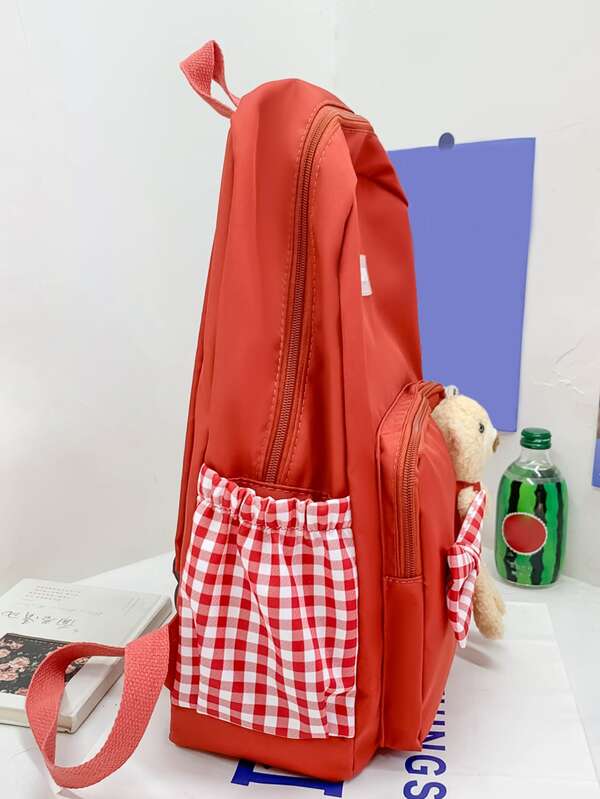 Girls Gingham Detail Functional Backpack Cartoon Bear & Letter Patch Decor