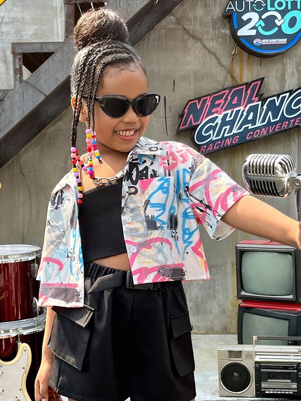 SHEIN Kids Cooltwn Girls Graffiti Print Drop Shoulder Crop Shirt Without Cami Top