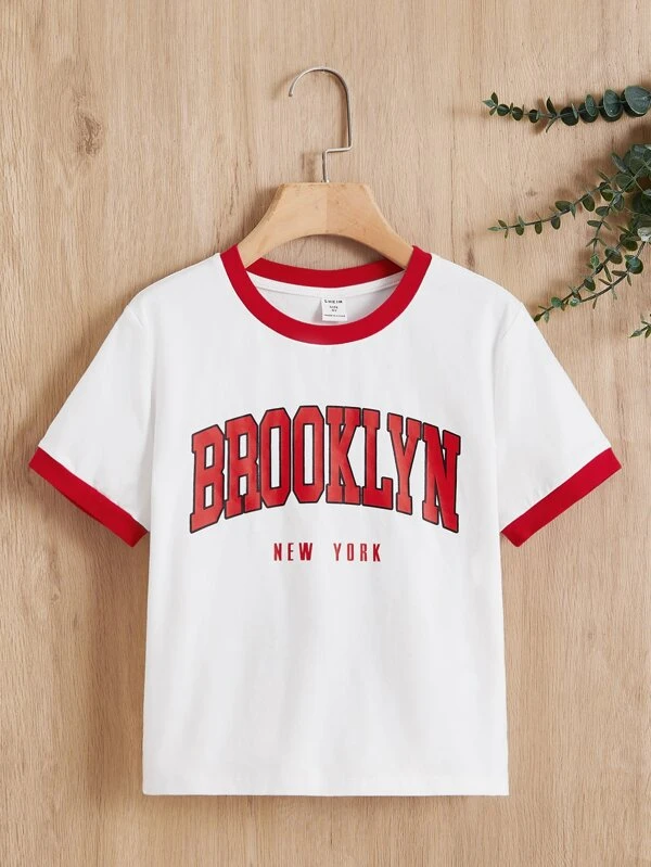 SHEIN Girls Letter Graphic Contrast Trim Tee