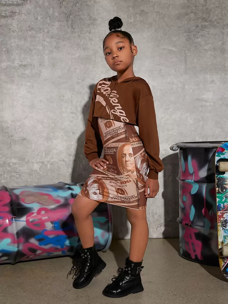 SHEIN Kids Cooltwn Tween Girl Letter Graphic Crop Sweatshirt & Dollar Print Cami Dress Set