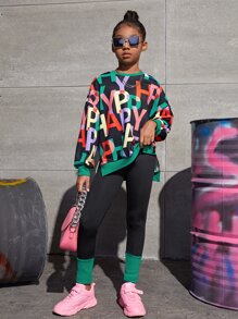 SHEIN Kids Cooltwn Tween Girl Letter Graphic Drop Shoulder Pullover & Leggings Set