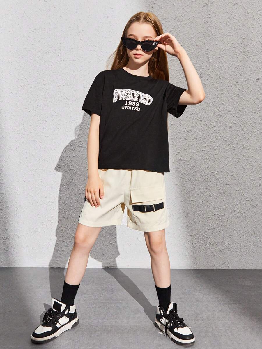 SHEIN Kids HYPEME Girls Letter Graphic Tee & Buckle Detail Flap Pocket Shorts