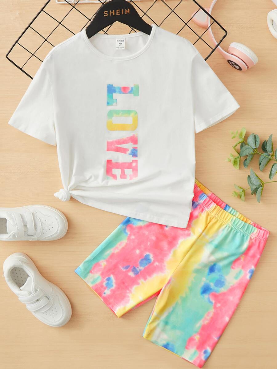 SHEIN Kids Y2Kool Tween Girl Letter Graphic Tee & Tie Dye Biker Shorts