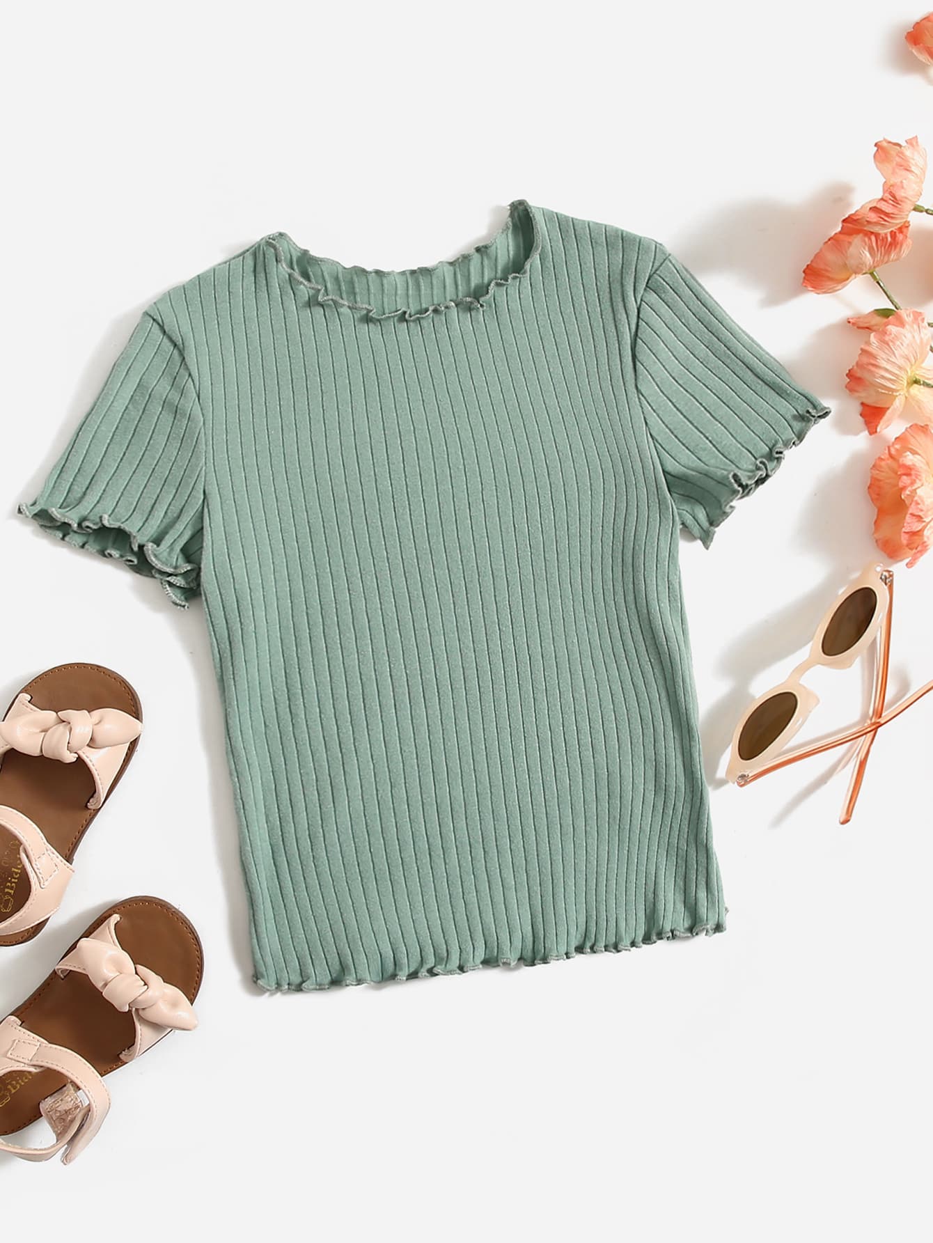SHEIN Kids EVRYDAY Girls Lettuce Trim Rib-knit Tee