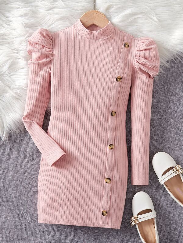 SHEIN Tween Girl Mock Neck Puff Sleeve Button Front Dress