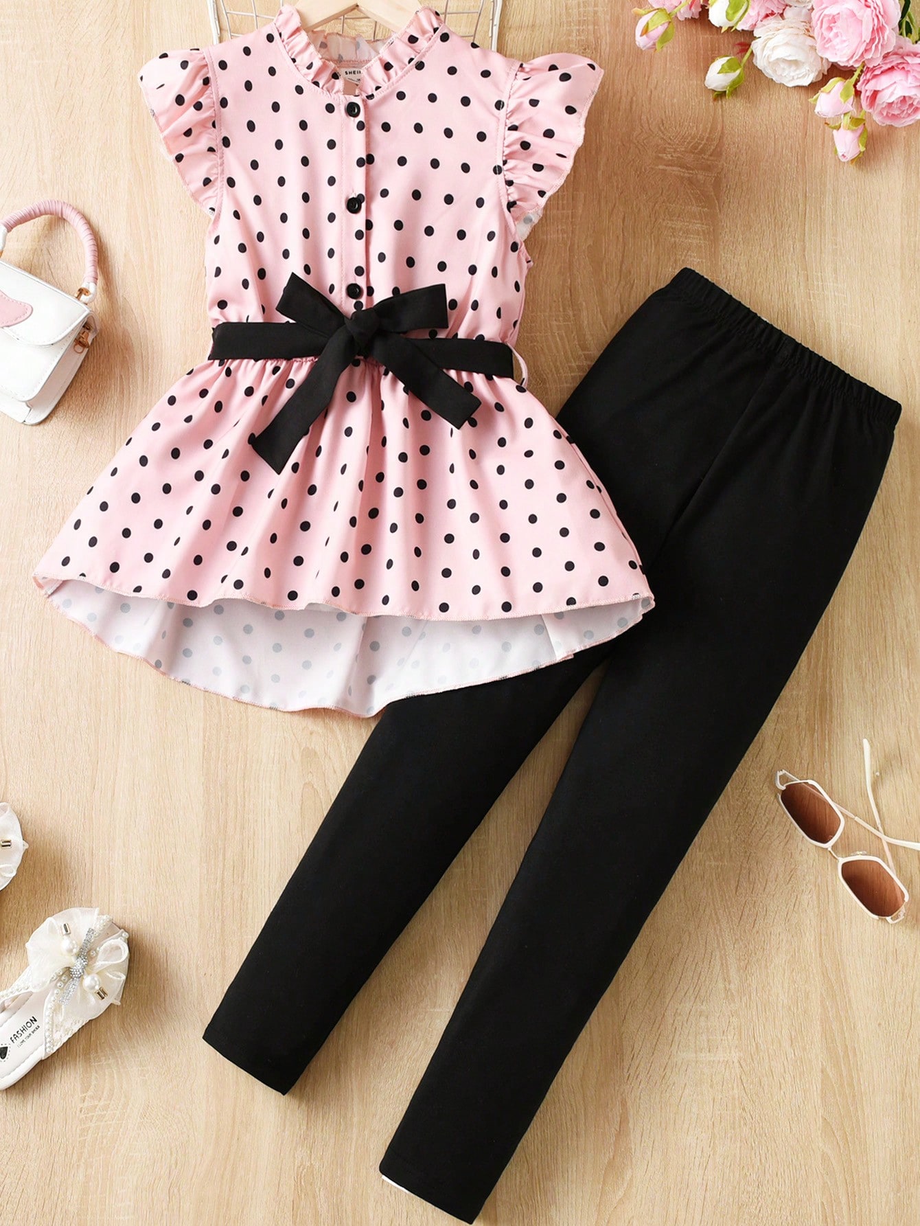 SHEIN Kids FANZEY Girls Polka Dot Print Ruffle Trim Belted Top & Leggings