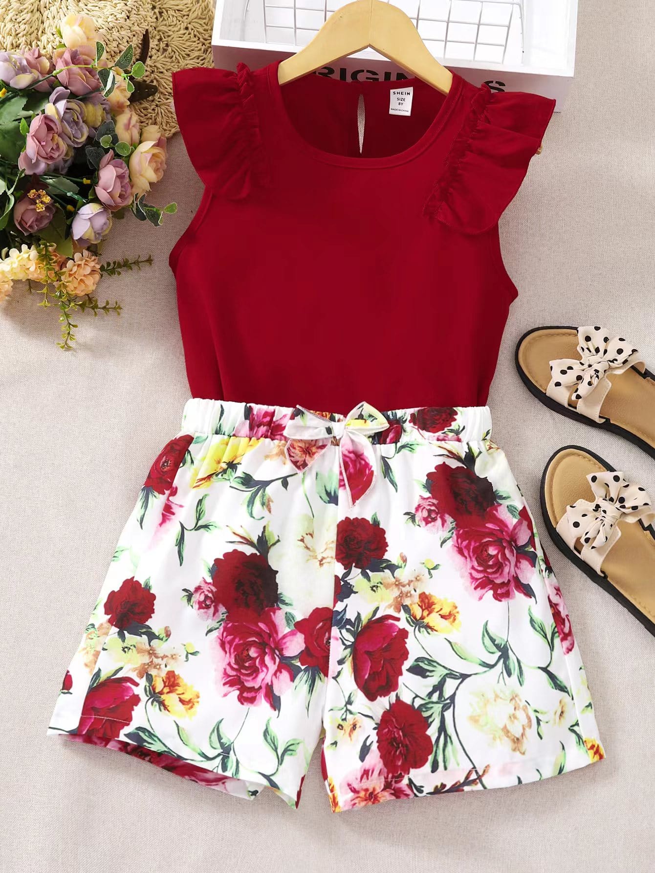 SHEIN Kids EVRYDAY Girls Ruffle Trim Blouse & Floral Print Bow Front Shorts