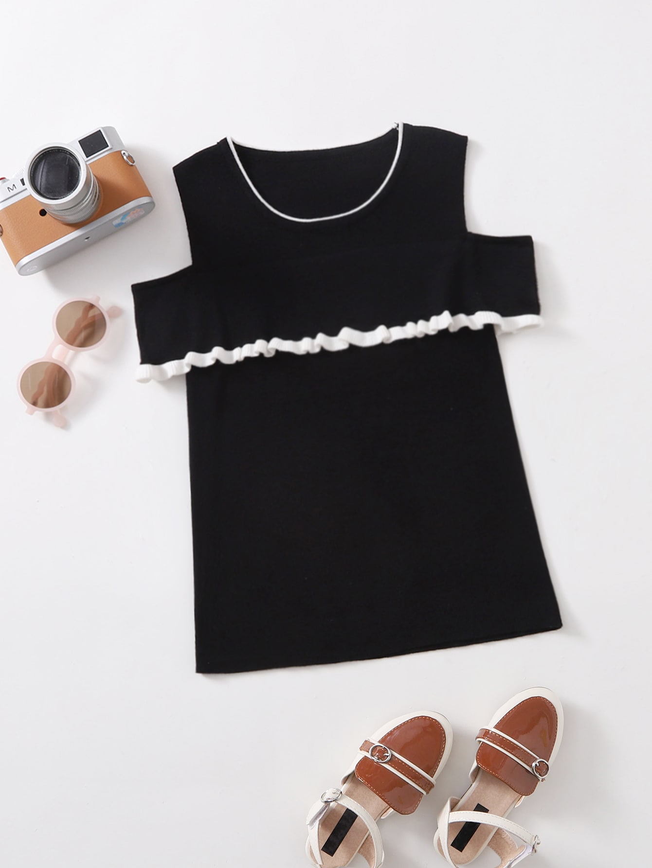 Girls Ruffle Trim Cold Shoulder Knit Top