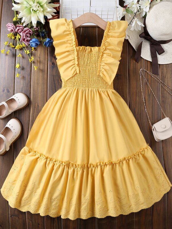 Girls Ruffle Trim Shirred Square Neck Eyelet Embroidery Hem Dress