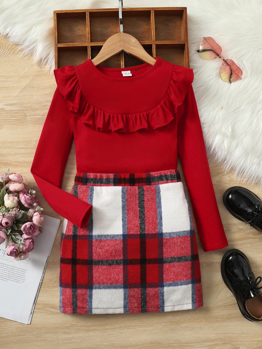 SHEIN Tween Girl Ruffle Trim Tee & Plaid Print Skirt
