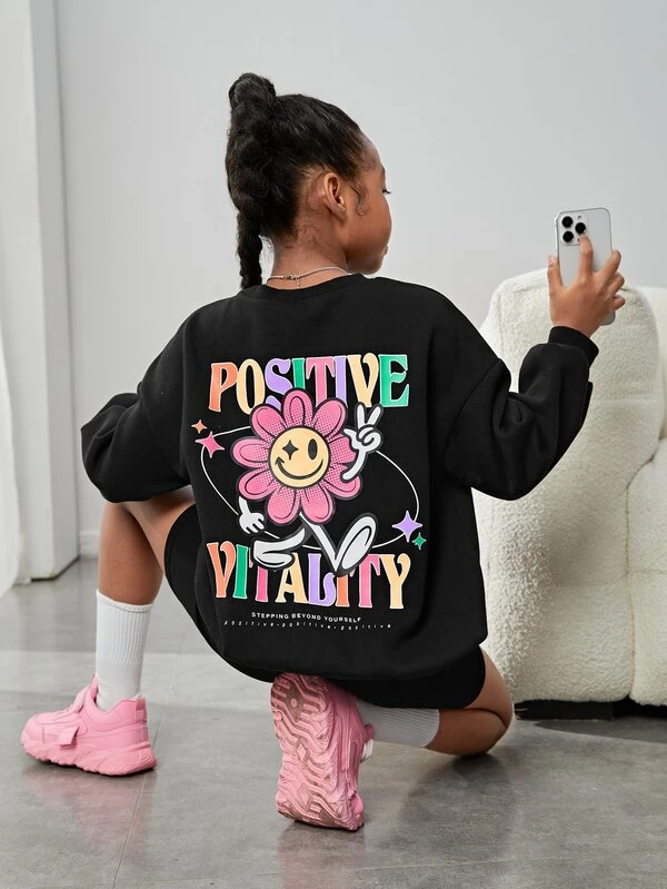 SHEIN Kids Cooltwn Tween Girl Slogan & Cartoon Graphic Drop Shoulder Thermal Sweatshirt