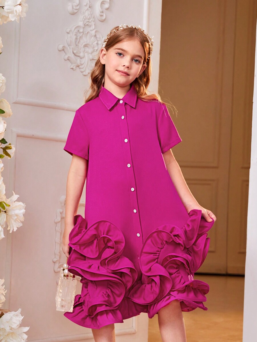 SHEIN Kids Nujoom Girls Solid Ruffle Trim Button Front Shirt Dress