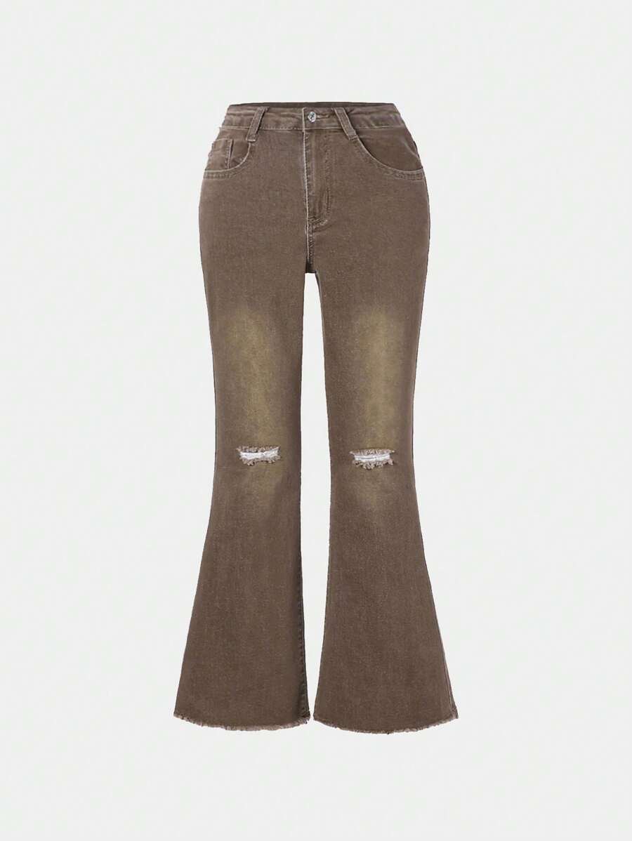 Girls Street Fashion Washed Water Cut Stretch Flared Jeans
