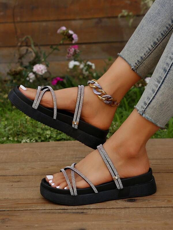 Glamorous Black Sandals For Women, Rhinestone Decor Flatform Slide Sandals