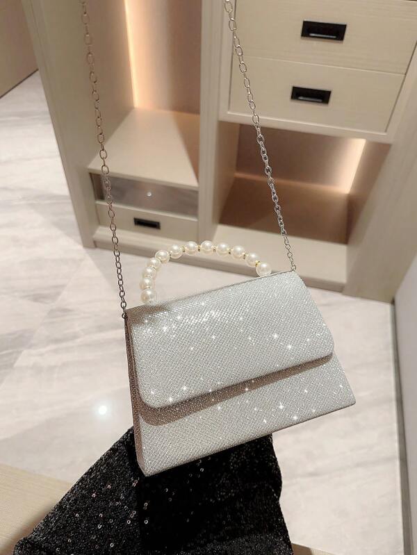Glitter Bling, Sequin, Luxury, Shiny Argyle Princess Faux Pearl & Rhinestone Pearl Chain & Decor Mini Square Bag Glitter Faux Pearl Decor Glamorous For Party, Wedding, Prom And Dinner, Lipsticks, Women's Pearl Bag Evening Bag, Dinner Bag For Party Girl, Woman, Bride Perfect For Party, Wedding, Prom, Dinner/Banquet, For
