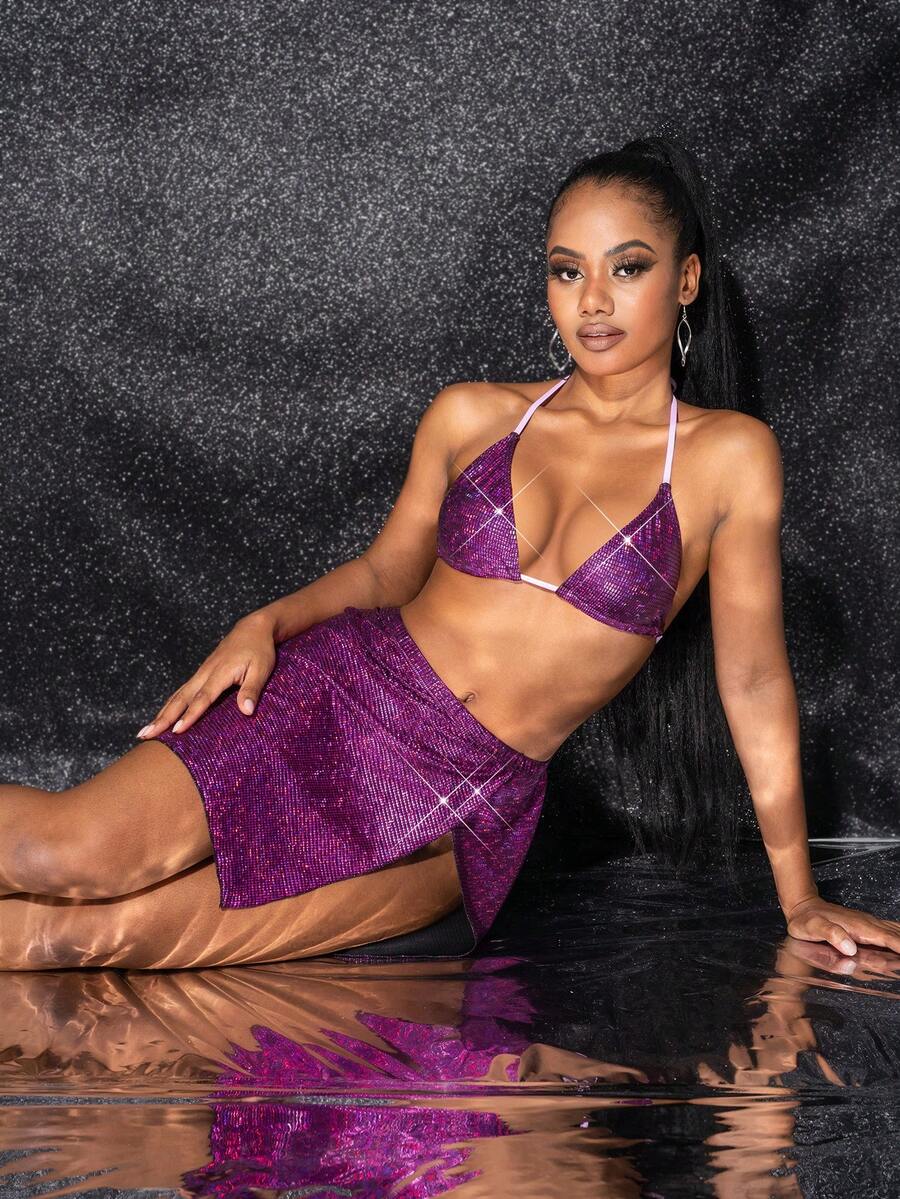 SHEIN Swim Y2GLAM Glitter Triangle Bikini Swimsuit With Beach Skirt