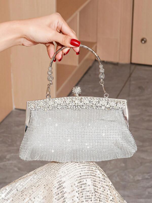 Glittering Rhinestone Decor Evening Clutch With Handle Strap For Party, Dancing, Light Luxury Clutch Purse For Women