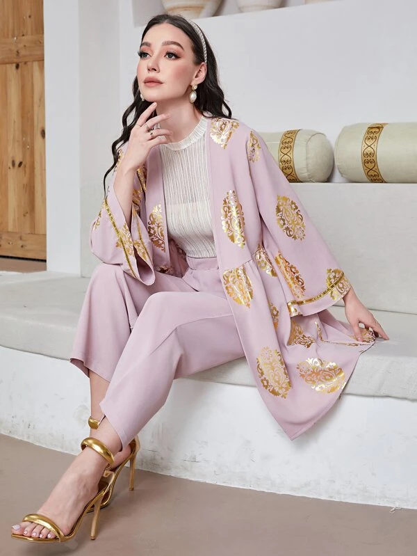 SHEIN Modely Gold Floral Print Open Front Coat & Pants