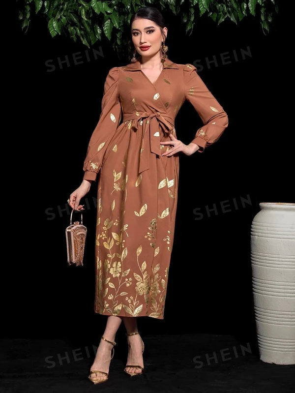 SHEIN Modely Gold Floral Print Puff Sleeve Belted Dress