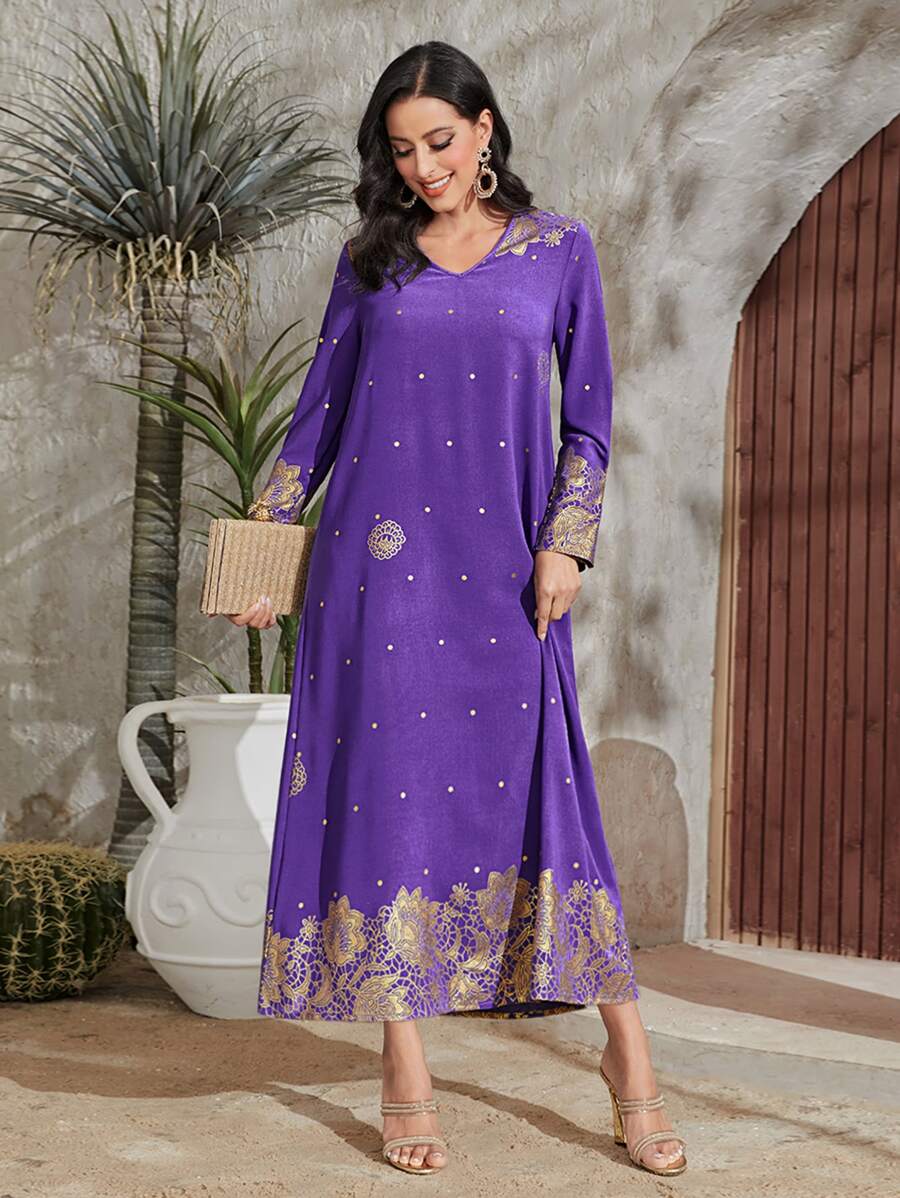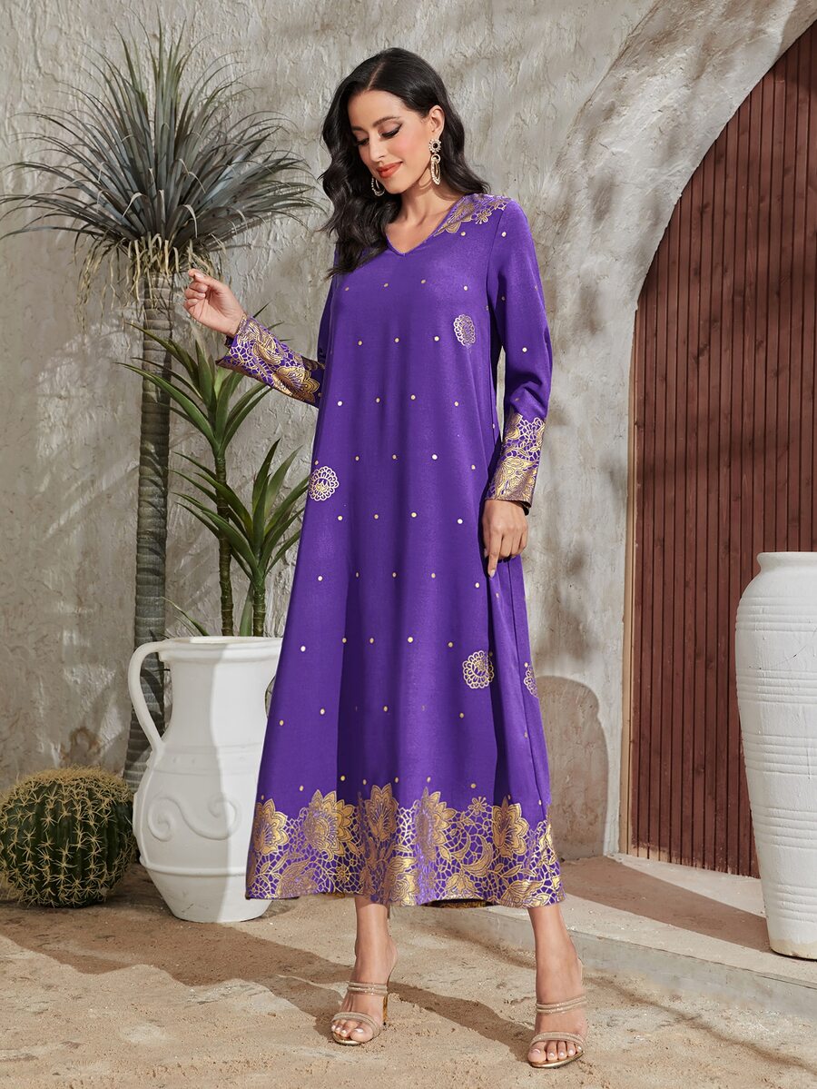 SHEIN Najma Gold Floral Print V Neck Dress