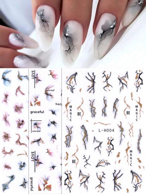 Gold Glitter Marble Nail Stickers 3pcs Colorful Gradient Blooming Floral Print Black Lightning Stripe Line 3D Self Adhesive Slider Manicure Nail Art Decoration