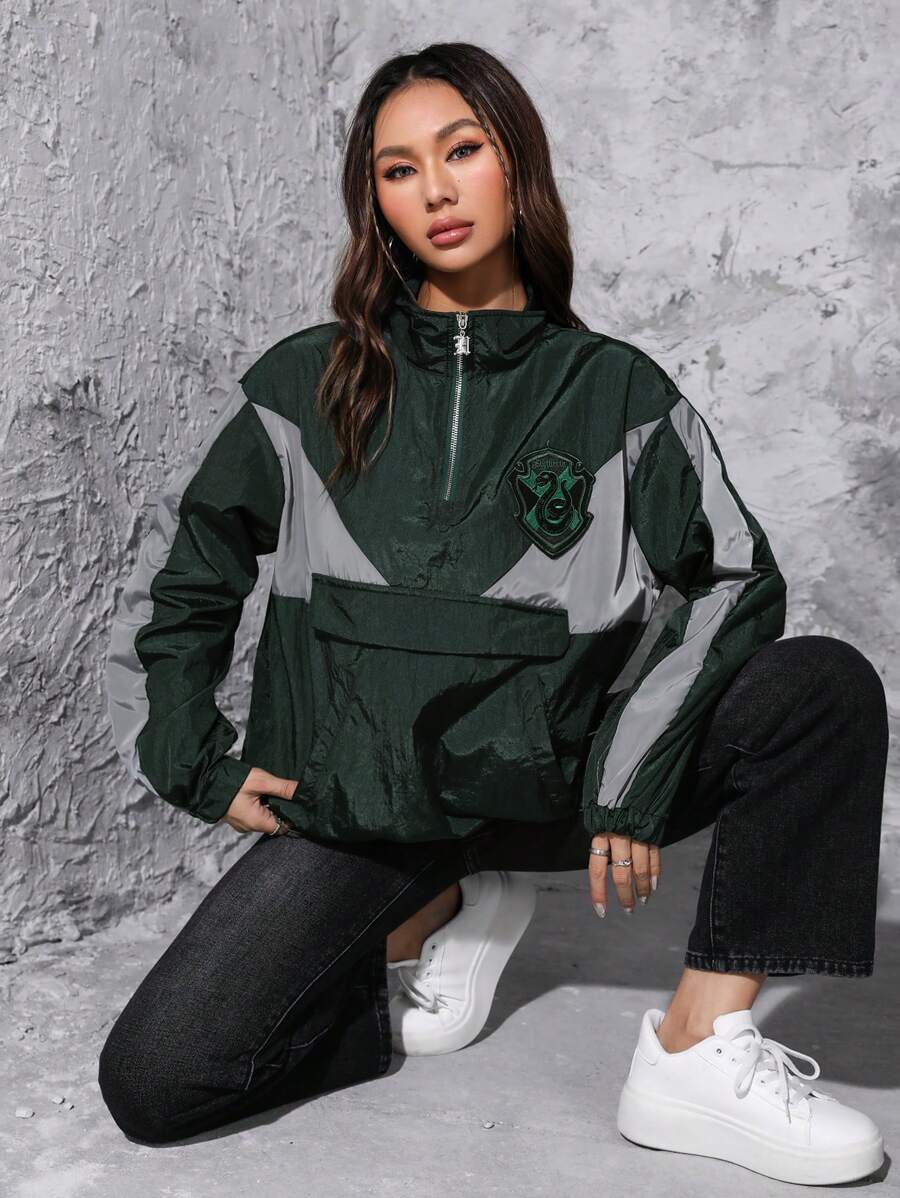 HARRY POTTER X SHEIN Graphic Patched Colorblock Half Zip Drop Shoulder Jacket