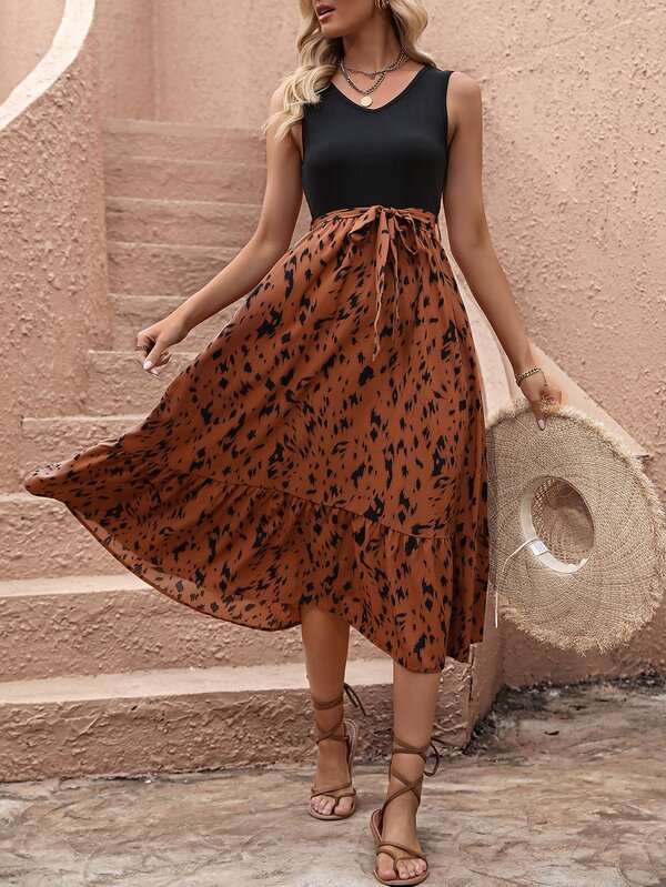 SHEIN VCAY Graphic Print Ruffle Hem Belted Dress