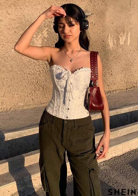 Apperloth A Grommet Lace Up Jacquard Frill Trim Pink Corset With Thong