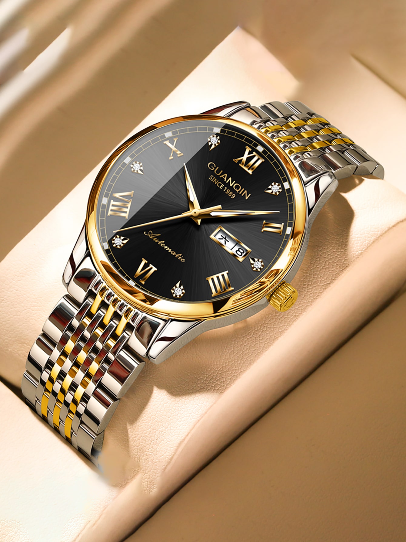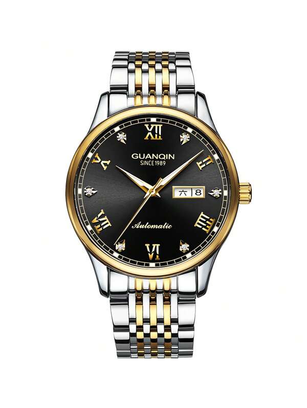 Guanqin Men's Gold-tone & Black Dial Stainless Steel Mechanical Watch With Rhinestone Inlaid Index & Pointer, Luminous & Calendar Function Watch For Daily Decoration Gj16137