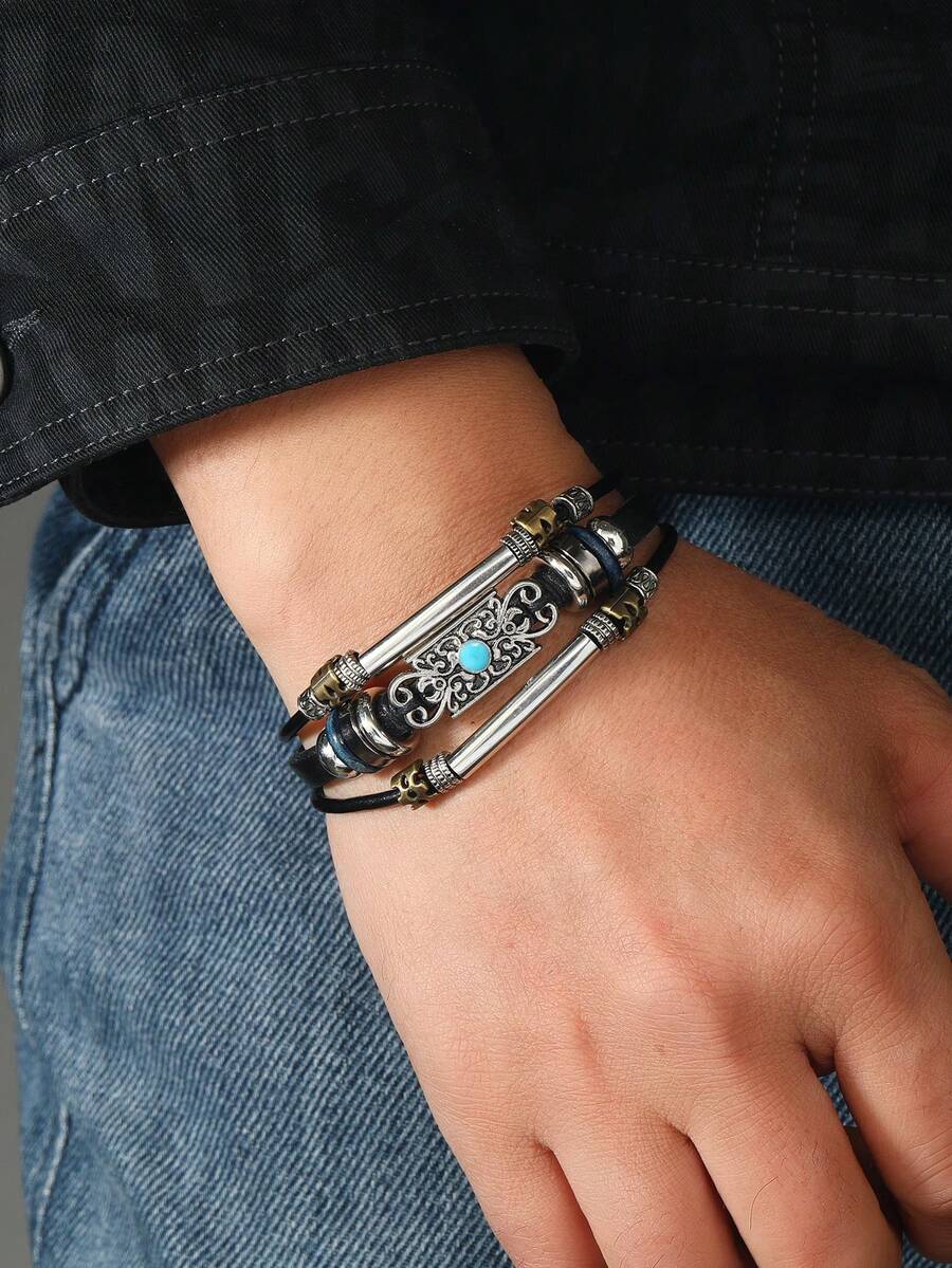 Handmade Woven Leather Bracelet With Vintage Alloy Multi-Layer Beaded Design Jewelry